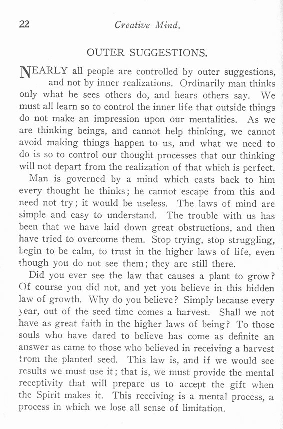 NEARLY all people are controlled by outer suggestions, and not by inner realizations. Ordinarily man thinks only what he sees others do, and hears others say. We must all learn so to control the inner life that outside things do not make an impression upon our mentalities. As we are thinking beings, and cannot help thinking, we cannot avoid making things happen to us, and what we need to do is so to control our thought processes that our thinking will not depart from the realization of that which is perfect.